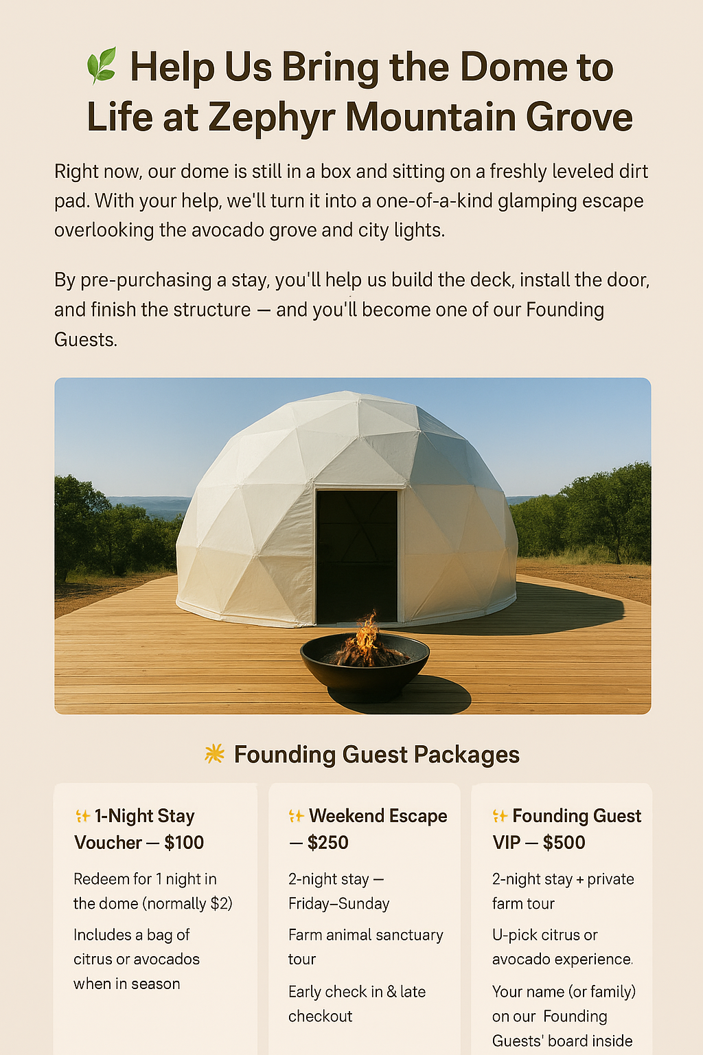 Categories: All Glamping Dome Pre Sale All / 1-Night Glamp Dome Stay Voucher - $100 Sale Weekend Escape - $250 Founding Guest VIP Weekend - $500
